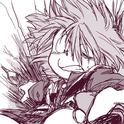 描きたかったのがホントに目だけなので、目ぇ描いてそれが見えるように髪の毛ザンバラにして、さあどうしようとぐりぐりしているうちにこんな訳のわからない体勢に。穴にでも落っこちてとっさにオカリナムチ伸ばした瞬間、みたいな感じ(うわひでェ)。