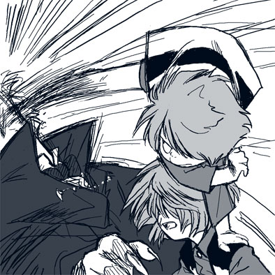 佐川の大好きな某猫ミュージカルの戦闘シーンで、敵と相対している猫の背から他の猫が飛び出して攻撃するところがありまして、あんな感じで戸田が高山の背中から飛び出して蹴り食らわしたりしたら格好良さげだわと描いてみましたが、イマイチ迫力が出ませんでした。後ろの汚いフリーハンド流線と蹴り倒されてる相手が適当すぎるせいが大きいのでしょうが。