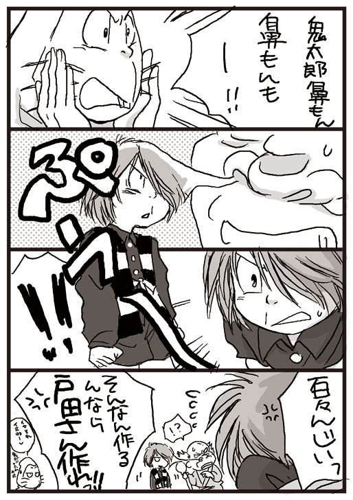 ところで先週の話ですが、ゲゲにょに戸田くん出ましたね!!他サイトさまたちの日記と某御方からのメールで知り、一日遅れで昨日期待しながら見たのですが、期待以上でした。部屋の隅にあるテレビにちらっと映るとかそんなんかと思ってたよ。画面いっぱいに3期OPが流れようとはv v vああんやっぱりかわいいいい。(このOPしょっちゅう見てるけど(笑))